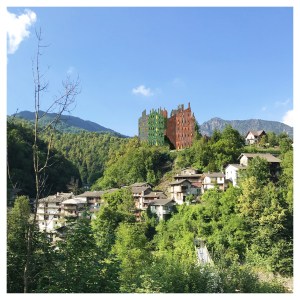 Ricostruzione del Castello di Viù. Vista del Castello, con le case della sottostante frazione Fucine, dall’ultimo tornante della SP n. 197 del Col del Lys (foto agosto 2020, DL).