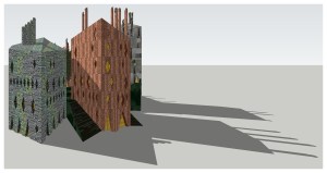 Ricostruzione del Castello di Viù, in località Versino. Scorcio prospettico con ombre. In primo piano l’edificio rivestito in mattoni forati e l’edificio rivestito in blocchi di pietra di montagna.