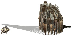 Prospettiva della casa per 2 tartarughe. Lato posteriore, con evidenziata la curvatura della facciata e la proiezione esasperata delle ombre.