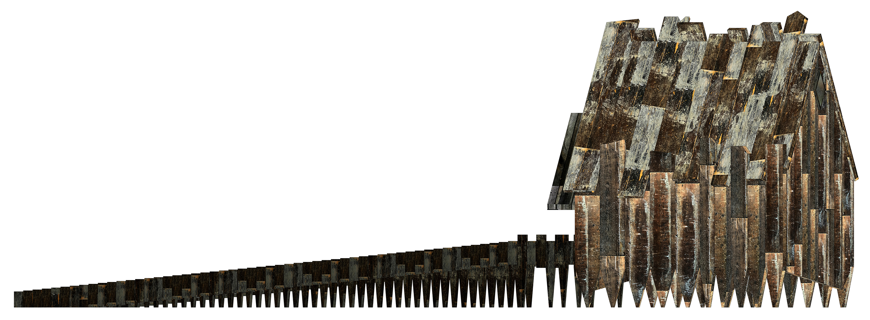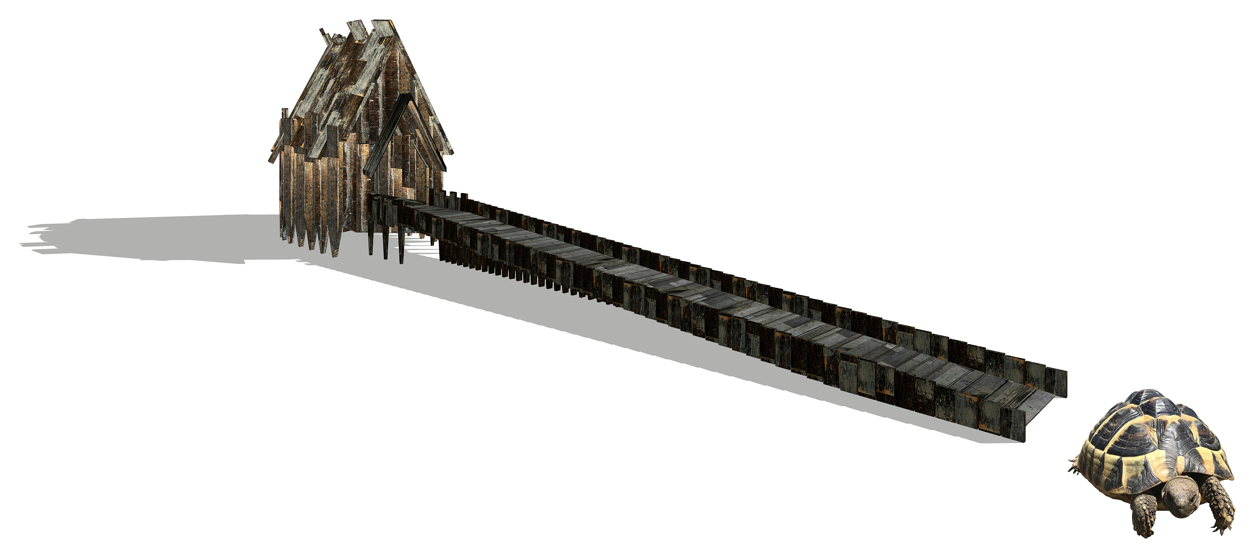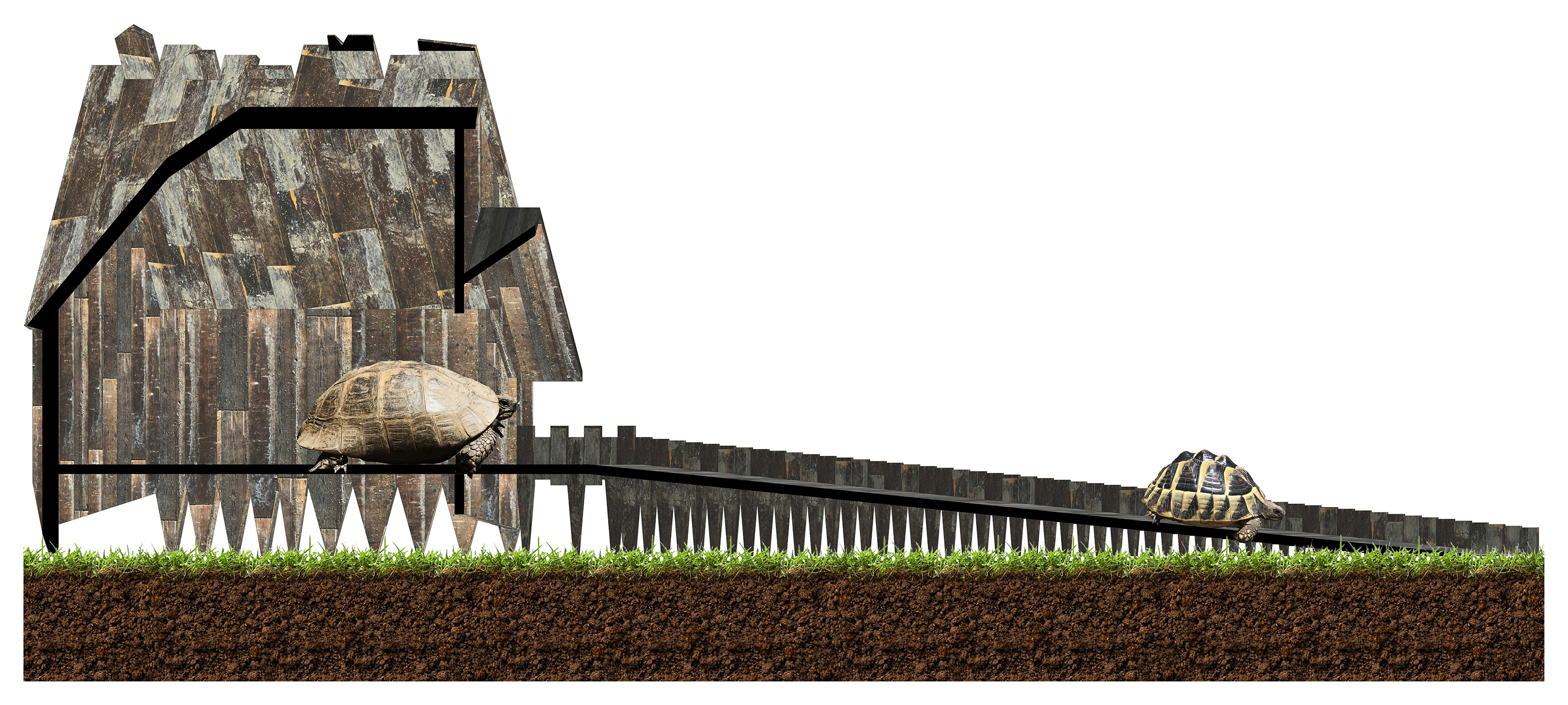 La casa per 2 tartarughe si articola in pianta con una forma corrispondente ad una porzione di corona circolare (porzione di anello) di superficie pari a 0,42 mq. La base della pianta è a circa 20 cm dal suolo. Sul fondo della porzione di anello sono presenti 5 fori per permettere l’allontanamento delle deiezioni dei rettili che vi soggiornano. Il fondo della base può essere riempito con del fieno: quando la temperatura esterna supera i 30° le tartarughe si rifugiano nel fieno, in quanto quest’ultimo rappresenta un ottimo materiale che isola dal caldo e dal calore, garantendo una condizione corporea più fresca. Per raggiungere l’ingresso posizionato al centro della porzione del raggio dell’anello, le tartarughe devono percorrere una lunghissima rampa (circa 2,30 m) dalla dolce pendenza (6°). L’ingresso è sormontato da un tettuccio sporgente a 2 falde. Sui lati della pianta si elevano verso l’alto i tamponamenti verticali, costituiti da assette di legno di spessore 2 cm. Questi ultimi rastremandosi verso il suolo, sorreggono la base della porzione di anello, sollevando la stessa da terra. Tanti pedini, quanti sono le assette di legno dei tamponamenti, lungo i lati curvi della pianta slanciano e danno accenno di verticalità alla forma della casa. Alcune assette delle facciate laterali, salendo verso l’alto, proseguono oltre la falda del tetto, altre si interrompono sotto lo spiovente dello stesso. Il tetto è a 2 falde con pendenza spiccata. Le superfici delle assette di legno sono carbonizzate con una fiamma al fine di rendere il legno più resistente agli agenti atmosferici. La carbonizzazione delle assette di legno determina sulla superficie delle stesse la colorazione nera-opaca che costituisce ricettore di raggi solari. I raggi solari catturati dalle superfici nere-opache riscaldano l’ambiente garantendo all’interno dello spazio una temperatura ottimale per il soggiorno dei rettili. In corrispondenza del colmo del tetto, in modo alternato, gli assi di legno si elevano descrivendo sulla sommità una cresta. Sul retro della piccola Architettura si trova, verso l’alto, al di sotto dello spiovente del tetto, una finestrella dalla forma romboidale.