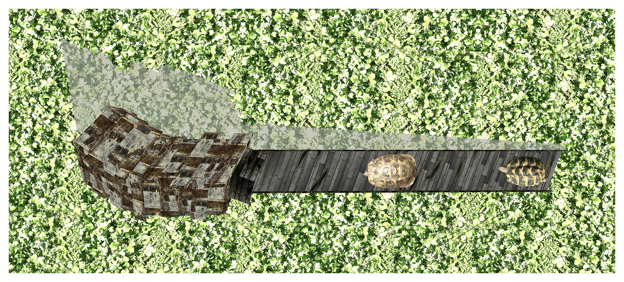 - Pianta della copertura e del tetto della casa per 2 tartarughe, con proiezione dell’ombra, su campo di rucola seminata in primavera. Varicella e la vecchia tartaruga percorrono la rampa per accedere nel vano.