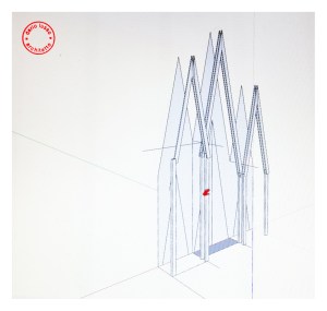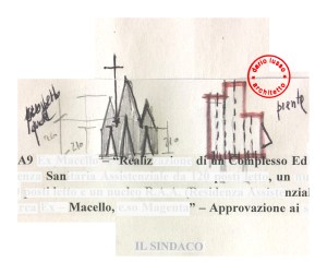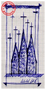 Questo è il progetto di una piccola cappella, in cui si può entrare nel suo interno: 3 navate di lunghezza, ampiezza ed altezza diverse – slanciate nella verticale dell’altezza e anguste in larghezza, gotiche nelle loro dimensioni. Sulla piccola chiesa (facciate e tetto) è posato un lenzuolo di lamiera arrugginita. Sul fronte della facciata, 3 aperture triangolari in ferro arrugginito, di altezza e larghezza diversa. Ognuna delle 3 cuspidi della facciata sono sormontate da profili di ferro che si concludono con 3 croci. Ognuna delle 3 aperture triangolari è munita di maniglie esterne sotto-forma un profilo di ferro arrugginito che raggiunge l’altezza delle 3 cuspidi della facciata e si conclude con altrettante croci. Le croci appese alle cuspidi della facciata sono più alte delle croci che coronano le maniglie delle aperture. La 7° croce, più grande e più alta delle altre, è ancorata vicina all’impluvio, dove convergono in facciata le 2 navate. Sul fronte della facciata il sagrato della chiesa, quale prolungamento del pavimento interno in lastre di korten. Le pareti interne, i soffitti e le strutture leggere interne sono candide e luminose.