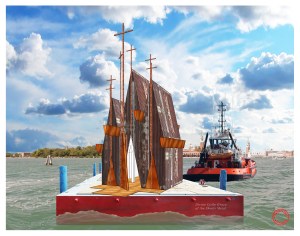 Il 2° collage è costruito su un immagine scaricata da Google Street View e raffigura il versante sud dell’Isola di San Giorgio Maggiore a Venezia, dove nel bosco fittamente alberato è realizzato il padiglione diffuso della Santa Sede alla 18. Biennale di Architettura di Venezia (Vatican Chapels, 10 cappelle + 1 padiglione espositivo). Una chiatta trainata da un rimorchiatore, lambisce al largo l’isola. Sulla chiatta è trasportata la Cappella della Divina Piccola Grazia delle Lamiere – quella coperta da un lenzuolo di lamiera arrugginita e da 7 altissime croci