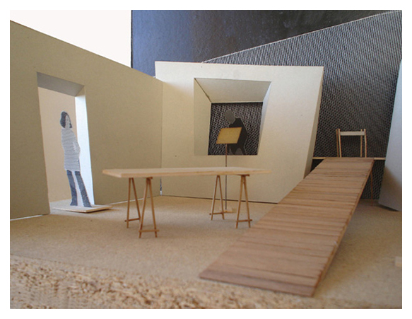 1 (UNA) RAMPA divide asimmetricamente il fondale. Realizzata con assi di legno unisce il piano della scena ad un “piano superiore”, posto a circa 80 cm. Su di esso si trova una sedia rappresentante “la stanza insonorizzata” – la stanza degli esperimenti -, nella quale verrà “annullato” Lamb. La rampa allude anche ad una “virtuale” separazione, non facilmente intuibile, tra lo spazio del “soggiorno” e quello dello “studio”. – soggiorno – e – studio – vivono nello stesso spazio ed interagiscono mutuamente: “ la rampa” è la poltrona, il divano, la sedia a seconda della necessità. La separazione dei luoghi è avviene grazie a fasci di luce che illumineranno punti diversi delle “quinte” e della “rampa”.