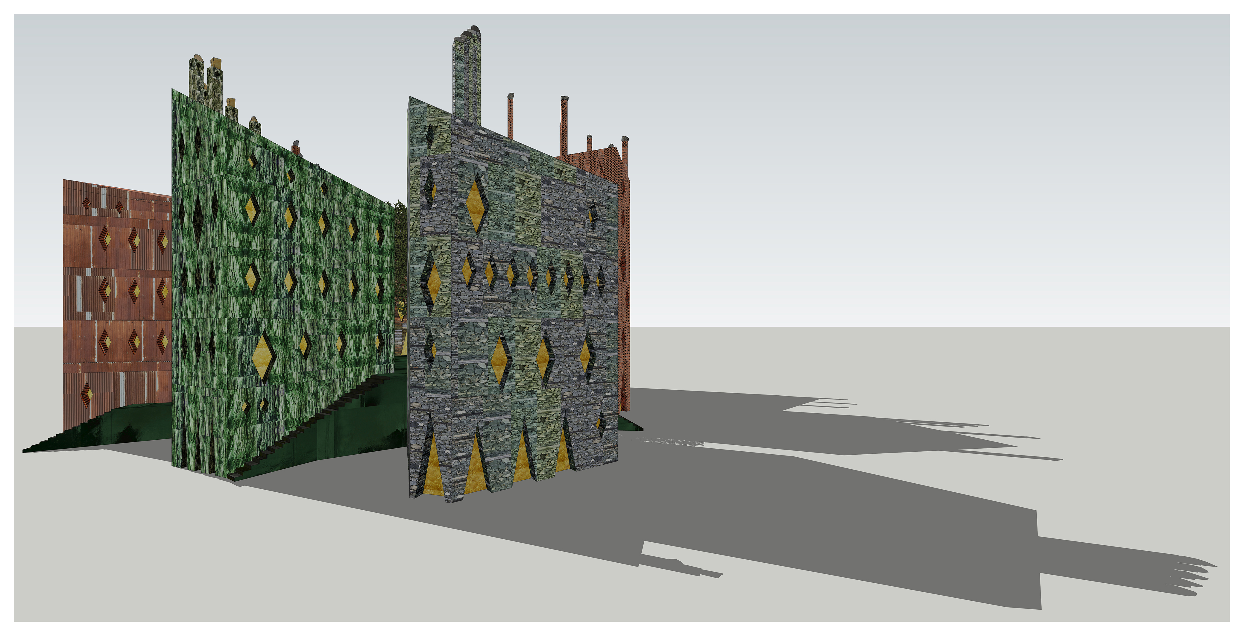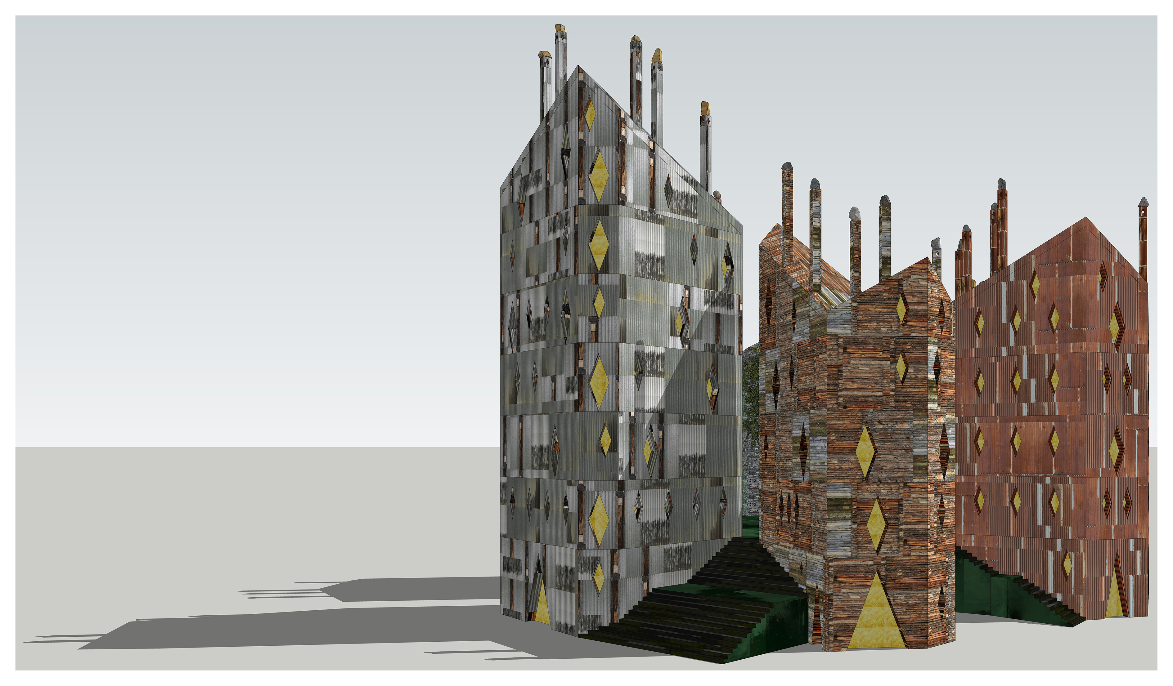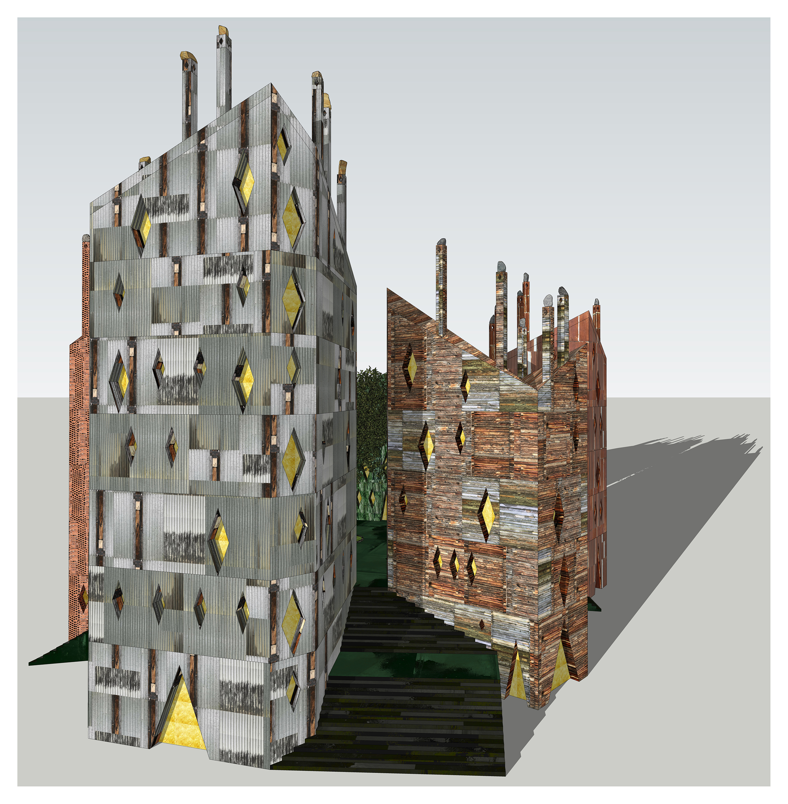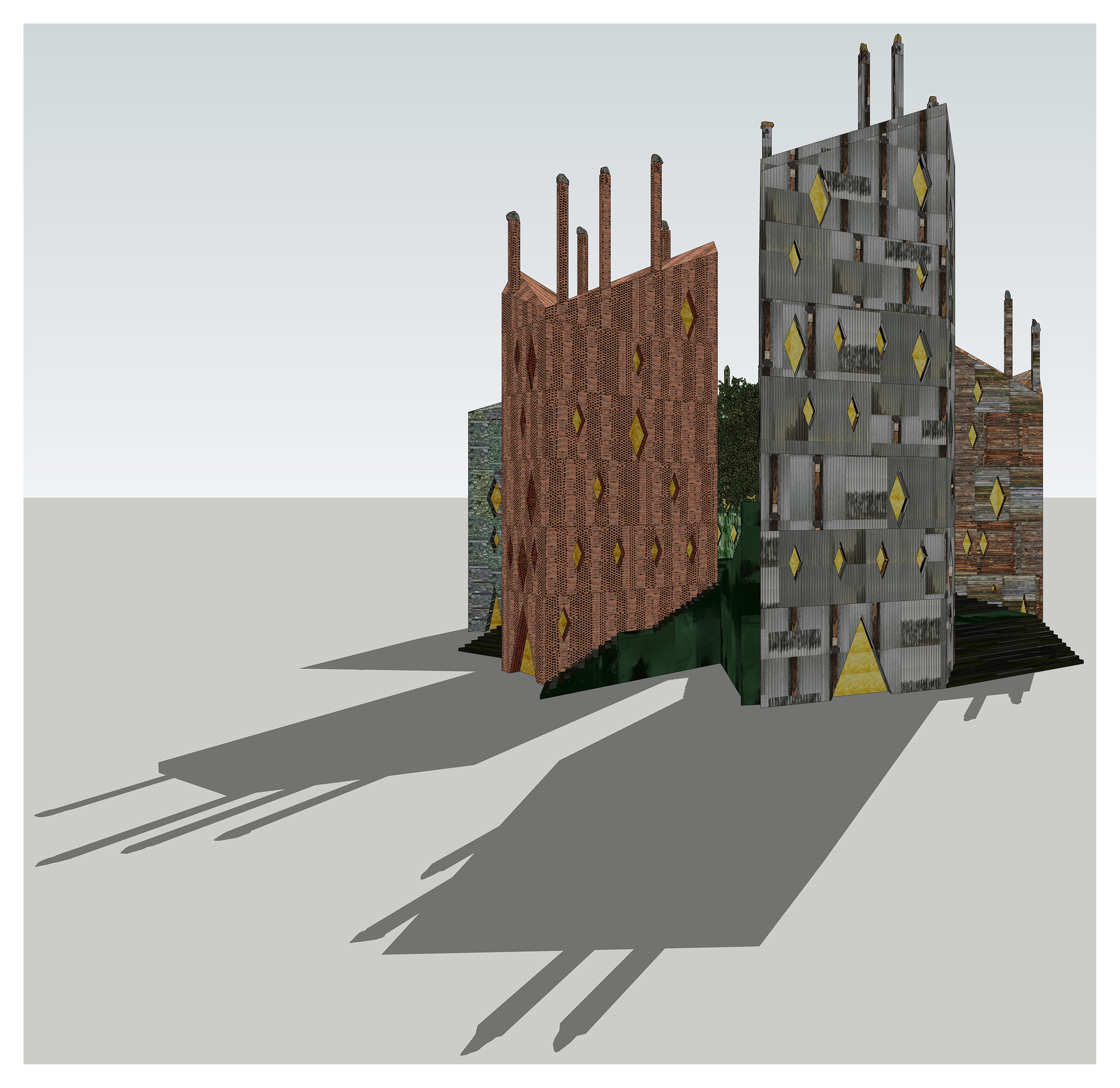 - Ricostruzione del Castello di Viù, in località Versino. Scorcio prospettico con ombre. In primo piano l’edificio rivestito in lamiera ondulata zincata con inserti in assette di legno e fianco-stante edificio rivestito in mattoni traforati.