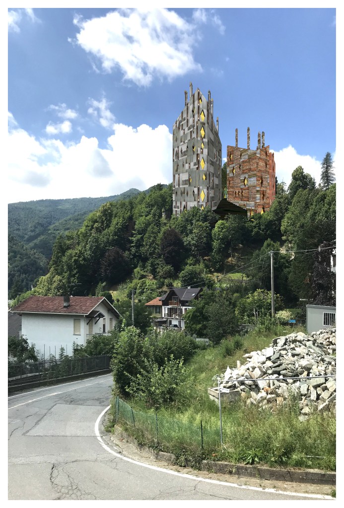- Ricostruzione del Castello di Viù, in località Versino. Scorcio prospettico con ombre. In primo piano l’edificio rivestito in lamiera ondulata zincata con inserti di assette di legno e la scalinata che dal bosco sala verso la Piazza.